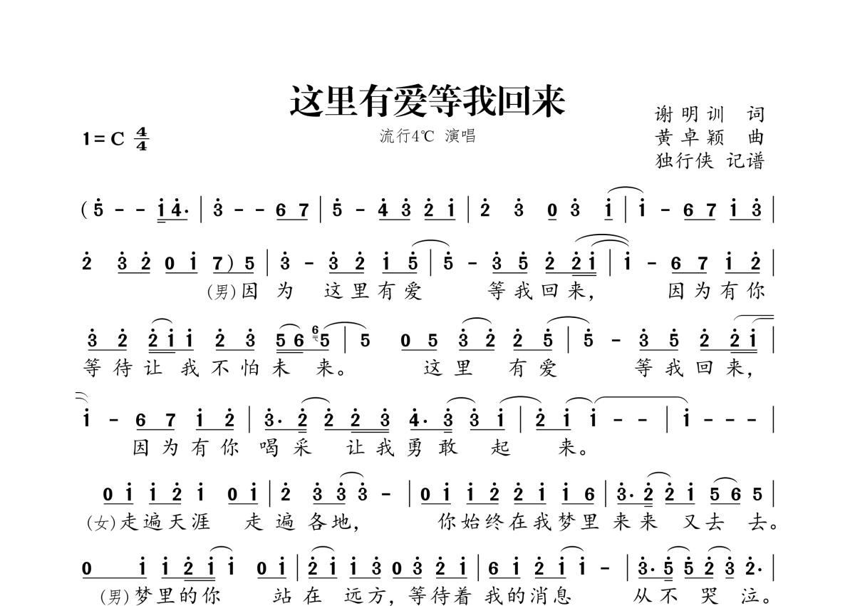 《这里有爱等我回来》是流行4℃演唱的一首歌曲,拍号为4/4拍,这份简谱共有两张高清图谱,图谱由 @独行侠 编配上传。