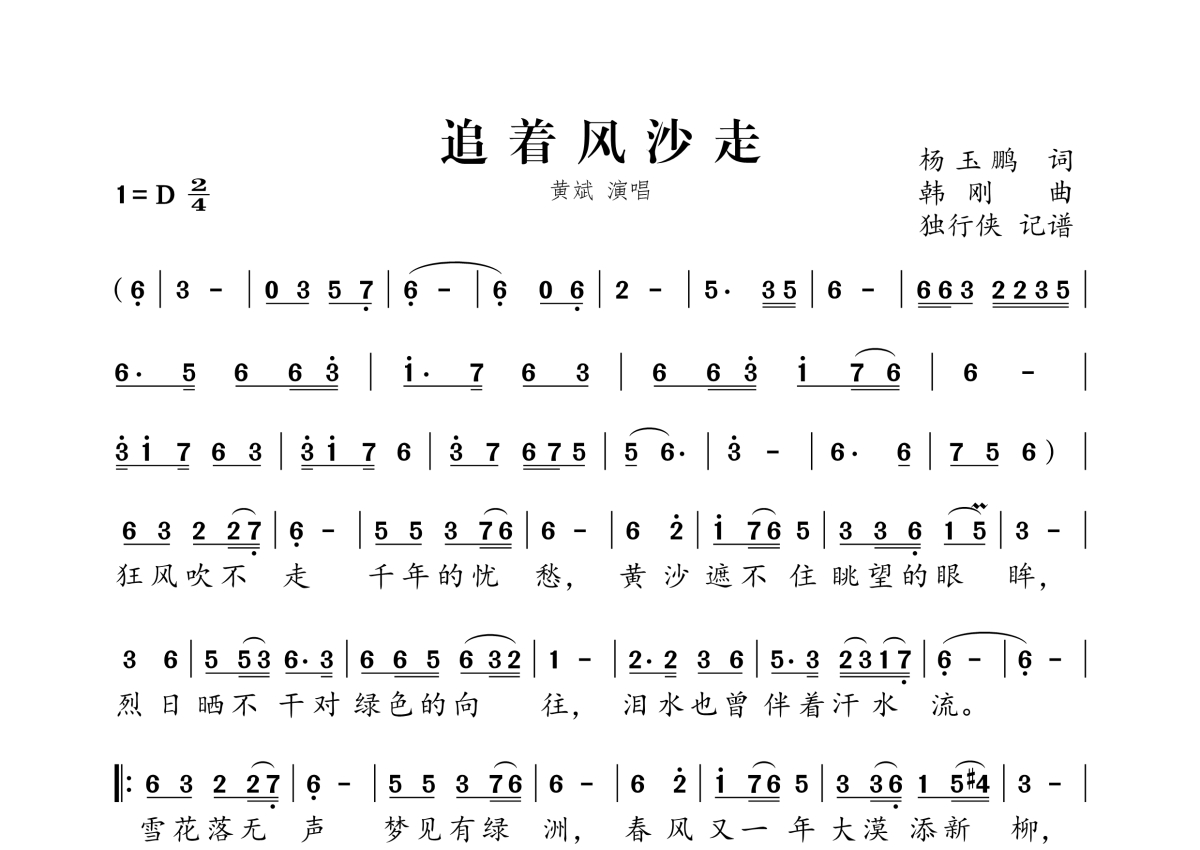 《追着风沙走》是黄斌演唱的一首歌曲,拍号为2/4拍,这份简谱共有一张高清图谱,图谱由 @独行侠 编配上传。