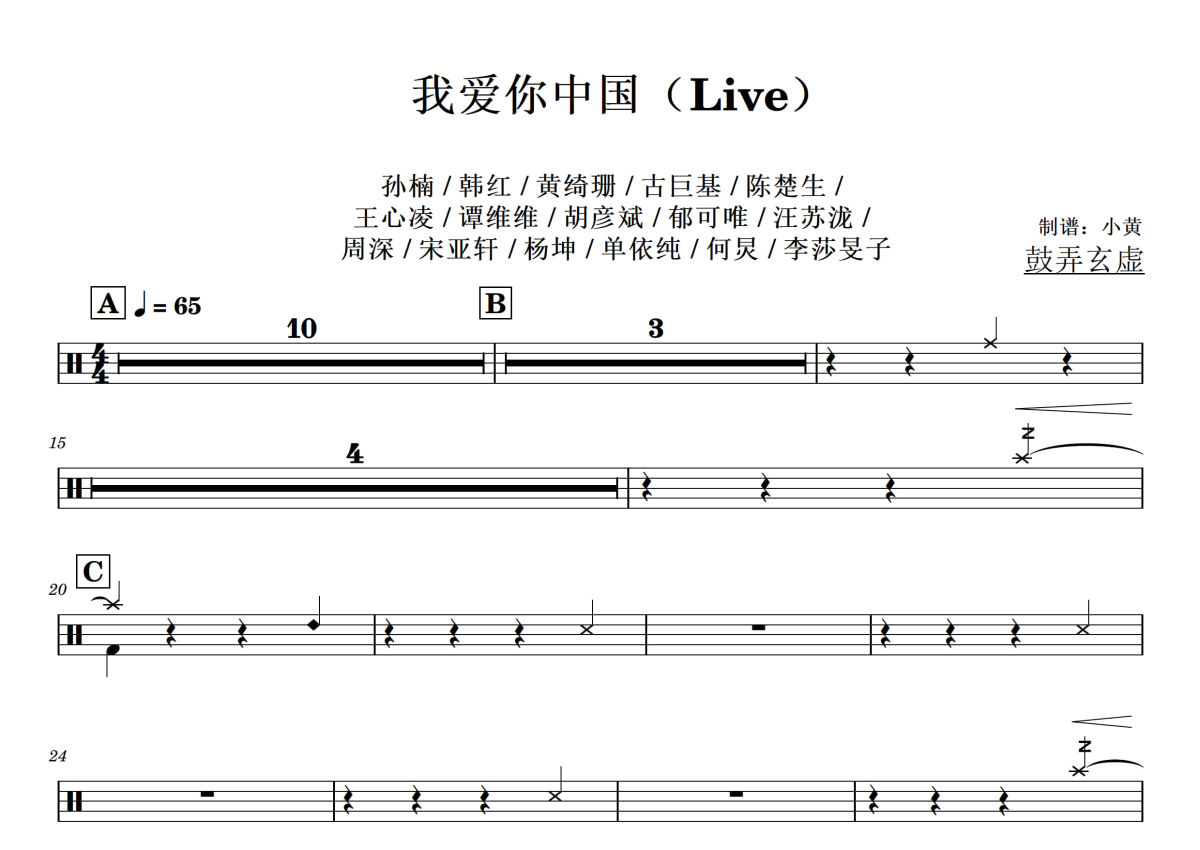 《我爱你中国live》是孙楠 / 韩红 / 黄绮珊 / 古巨基 / 陈楚生 / 王心凌 / 谭维维 / 胡彦斌 / 郁可唯 / 汪苏泷 /周深 / 宋亚轩 / 杨坤 / 单依纯 / 何炅 / 李莎旻子演唱的一首歌曲,拍号为4/4拍,歌曲速度为每分钟65拍,这份架子鼓谱共有三张高清图谱,图谱由 @小黄 编配上传,图谱使用五线谱编配,使用这份我爱你中国live架子鼓谱,你将能够轻松地敲打出这首孙楠 / 韩红 / 黄绮珊 / 古巨基 / 陈楚生 / 王心凌 / 谭维维 / 胡彦斌 / 郁可唯 / 汪苏泷 /周深 / 宋亚轩 / 杨坤 / 单依纯 / 何炅 / 李莎旻子的我爱你中国live,快来尝试吧。