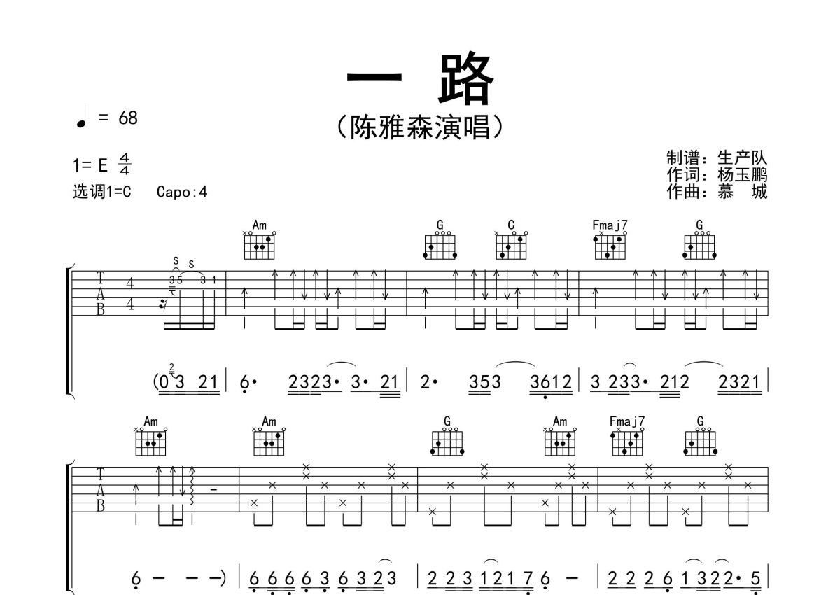 《一路》是陈雅森演唱的一首歌曲,精编完美版,拍号为4/4拍,歌曲速度为每分钟68拍,歌曲原调为E调,但由于原调指法比较难,为了方便弹奏,本吉他谱采用的是C调指法编配,变调夹4品弹奏即为原调,当然也可以根据自己的音域改变变调夹位置,或者通过改变和弦调性,以方便自己弹奏,这份吉他谱共有三张高清图谱,图谱由 @生产队 编配上传,图谱使用六线谱编配,包含吉他和弦指法、简谱以及歌词部分,使用这份一路吉他谱,可以让你更加方便地掌握这首歌曲的弹唱技巧,快来尝试吧。陈雅森演唱的歌曲《一路》原版吉他谱,完整的前奏、间奏solo编配。
