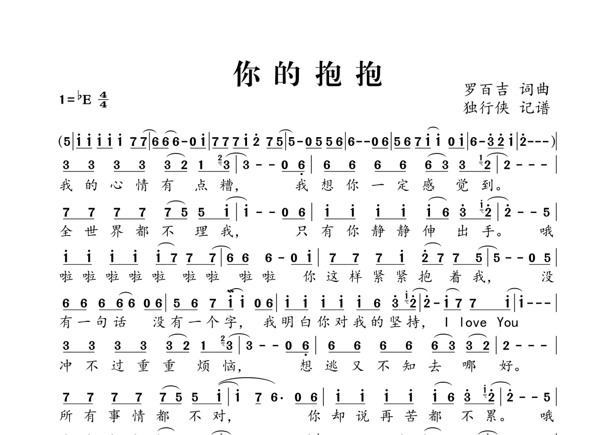 《你的抱抱》,拍号为4/4拍,这份简谱共有一张高清图谱,图谱由 @独行侠 编配上传。