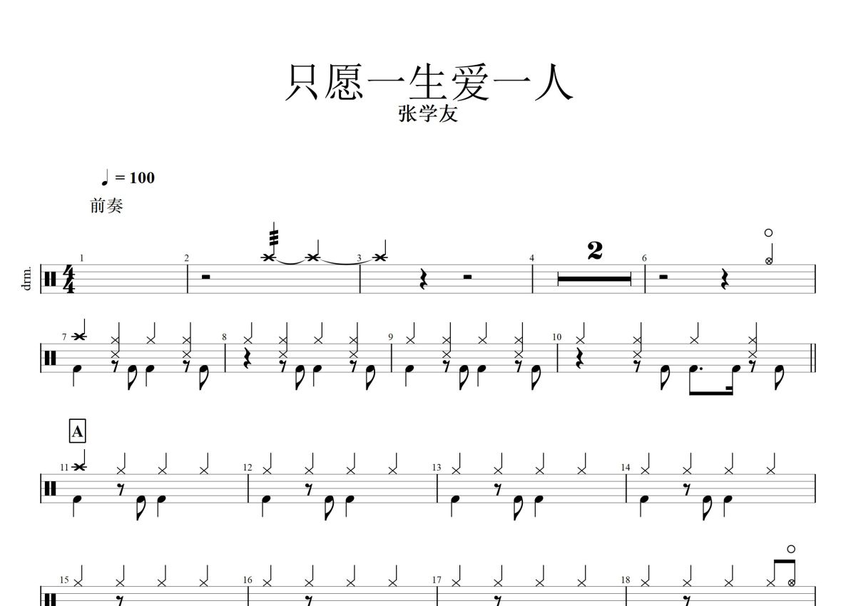 《只愿一生爱一人》是张学友演唱的一首歌曲,这份鼓谱共有三张高清图谱,图谱由 @打鼓谱 编配上传,图谱使用五线谱编配,使用这份只愿一生爱一人架子鼓谱,你将能够轻松地敲打出这首张学友的只愿一生爱一人,快来尝试吧。《只愿一生爱一人》是张学友于1989年12月1日发行的粤语专辑。该专辑共收录了10首歌曲。专辑由欧丁玉担任制作人。