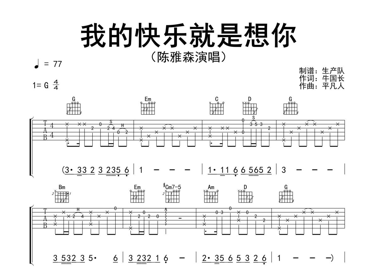 《我的快乐就是想你》是陈雅森演唱的一首歌曲,精编完美版,拍号为4/4拍,歌曲速度为每分钟77拍,歌曲原调为G调,本吉他谱采用的是G调指法编配,演奏时不需要使用变调夹即为原调,这份吉他谱共有三张高清图谱,图谱由 @生产队 编配上传,图谱使用六线谱编配,包含吉他和弦指法、简谱以及歌词部分,使用这份我的快乐就是想你吉他谱,可以让你更加方便地掌握这首歌曲的弹唱技巧,快来尝试吧。陈雅森演唱的经典歌曲《我的快乐就是想你》原版吉他谱,精准的前奏、间奏solo编配,精编完美版。