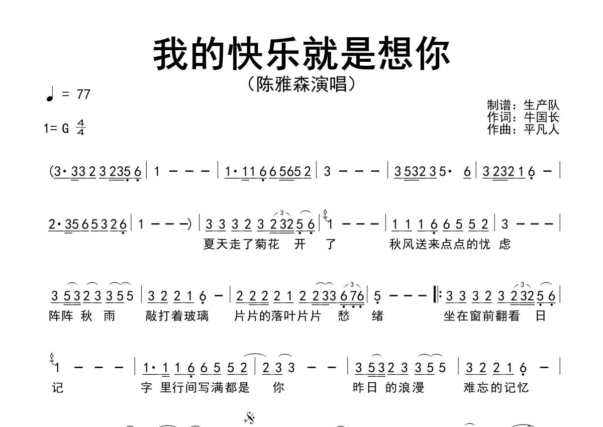 《我的快乐就是想你》是陈雅森演唱的一首歌曲,原版简谱,拍号为4/4拍,歌曲速度为每分钟77拍,这份简谱共有一张高清图谱,图谱由 @生产队 编配上传陈雅森演唱的经典歌曲《我的快乐就是想你》原版简谱,精准的前奏、间奏solo编配。