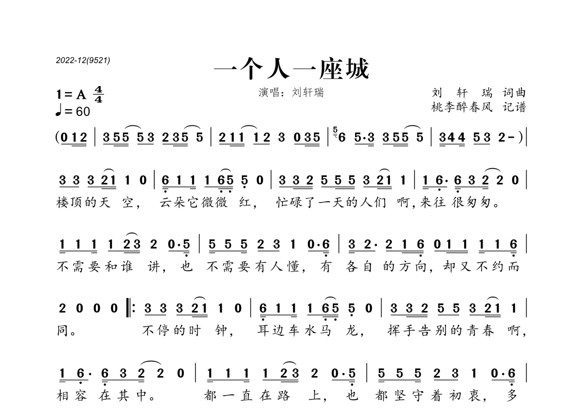 《一个人一座城》是刘瑞轩演唱的一首歌曲,拍号为4/4拍,歌曲速度为每分钟60拍,这份简谱共有一张高清图谱,图谱由 @桃李醉春风 编配上传。