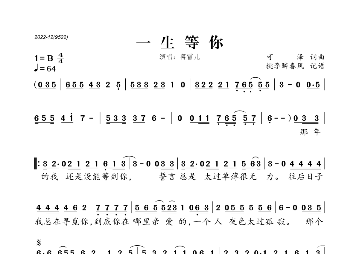 《一生等你》是蒋雪儿演唱的一首歌曲,拍号为4/4拍,歌曲速度为每分钟64拍,这份简谱共有一张高清图谱,图谱由 @桃李醉春风 编配上传。