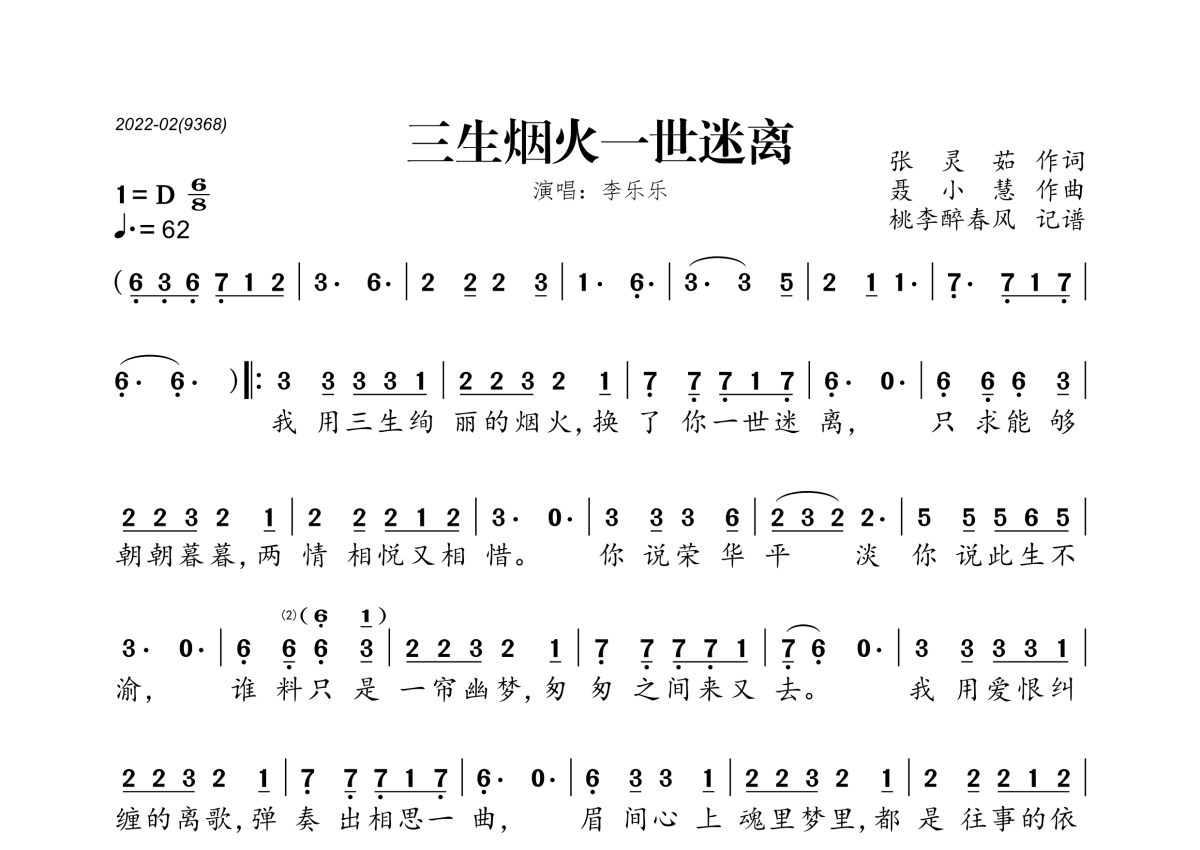 《三生烟火一世迷离》是李乐乐演唱的一首歌曲,拍号为6/8拍,歌曲速度为每分钟62拍,这份简谱共有一张高清图谱,图谱由 @桃李醉春风 编配上传。