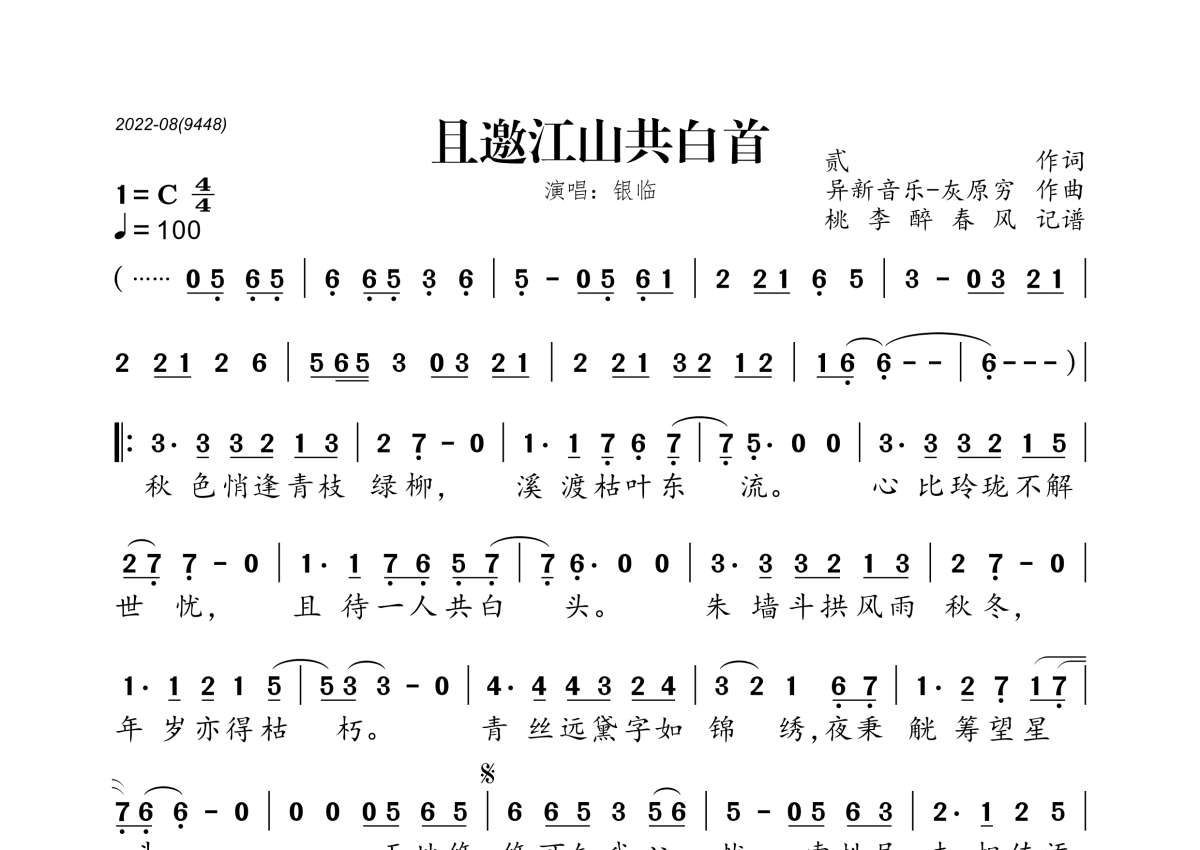 《且邀江山共白首》是银临演唱的一首歌曲,拍号为4/4拍,歌曲速度为每分钟100拍,这份简谱共有一张高清图谱,图谱由 @桃李醉春风 编配上传。