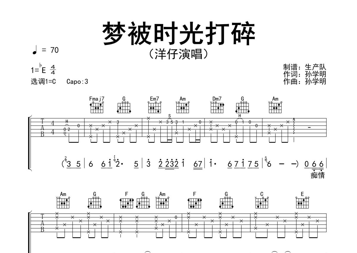 《梦被时光打碎》是洋仔演唱的一首歌曲,精编完美版,拍号为4/4拍,歌曲速度为每分钟70拍,歌曲原调为Eb调,但由于原调指法比较难,为了方便弹奏,本吉他谱采用的是C调指法编配,变调夹3品弹奏即为原调,当然也可以根据自己的音域改变变调夹位置,或者通过改变和弦调性,以方便自己弹奏,这份吉他谱共有三张高清图谱,图谱由 @生产队 编配上传,图谱使用六线谱编配,包含吉他和弦指法、简谱以及歌词部分,使用这份梦被时光打碎吉他谱,可以让你更加方便地掌握这首歌曲的弹唱技巧,快来尝试吧。洋仔演唱的民谣歌曲《梦被时光打碎》原版吉他谱,精准的前奏、间奏、尾奏solo编配。