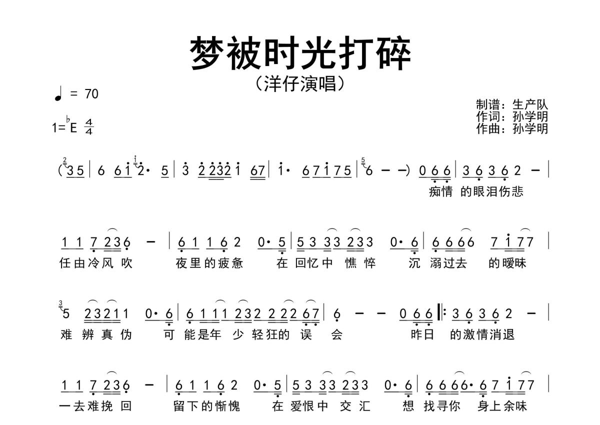 《梦被时光打碎》是洋仔演唱的一首歌曲,原版简谱,拍号为4/4拍,歌曲速度为每分钟70拍,这份简谱共有一张高清图谱,图谱由 @生产队 编配上传洋仔演唱的歌曲《梦被时光打碎》原版简谱,精准的前奏、间奏、尾奏solo编配。
