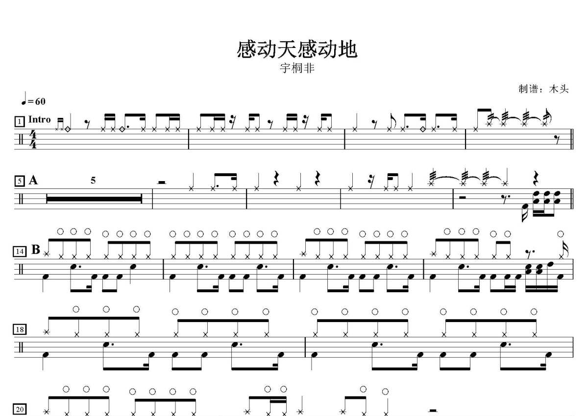 《感动天感动地》是宇桐非演唱的一首歌曲,这份鼓谱共有两张高清图谱,图谱由 @打鼓谱 编配上传,图谱使用五线谱编配,使用这份感动天感动地架子鼓谱,你将能够轻松地敲打出这首宇桐非的感动天感动地,快来尝试吧。歌曲名:感动天感动地,歌手名:宇桐非,专辑名:与你同飞。