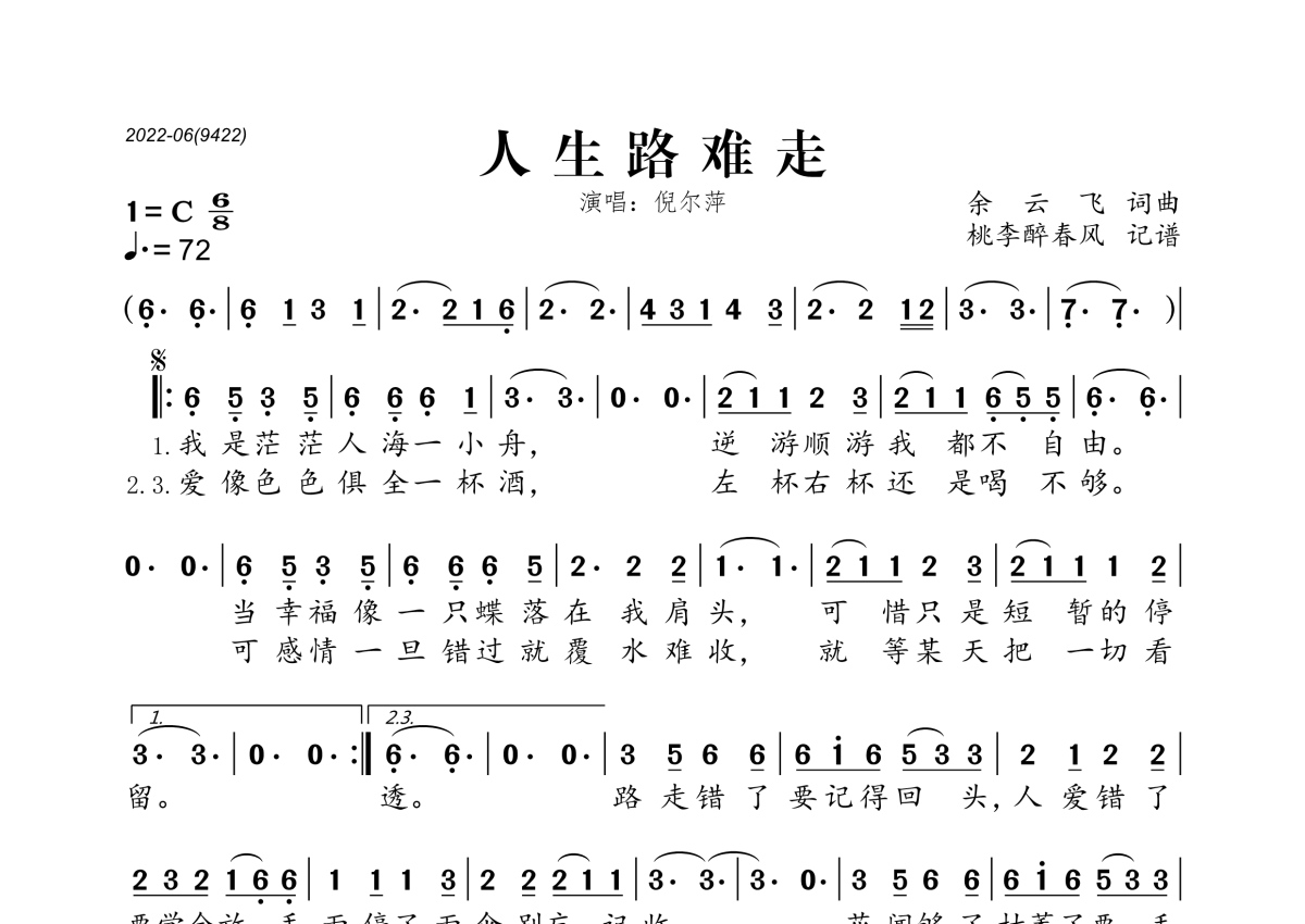 《人生路难走》是倪尔萍演唱的一首歌曲,拍号为6/8拍,歌曲速度为每分钟72拍,这份简谱共有一张高清图谱,图谱由 @桃李醉春风 编配上传。