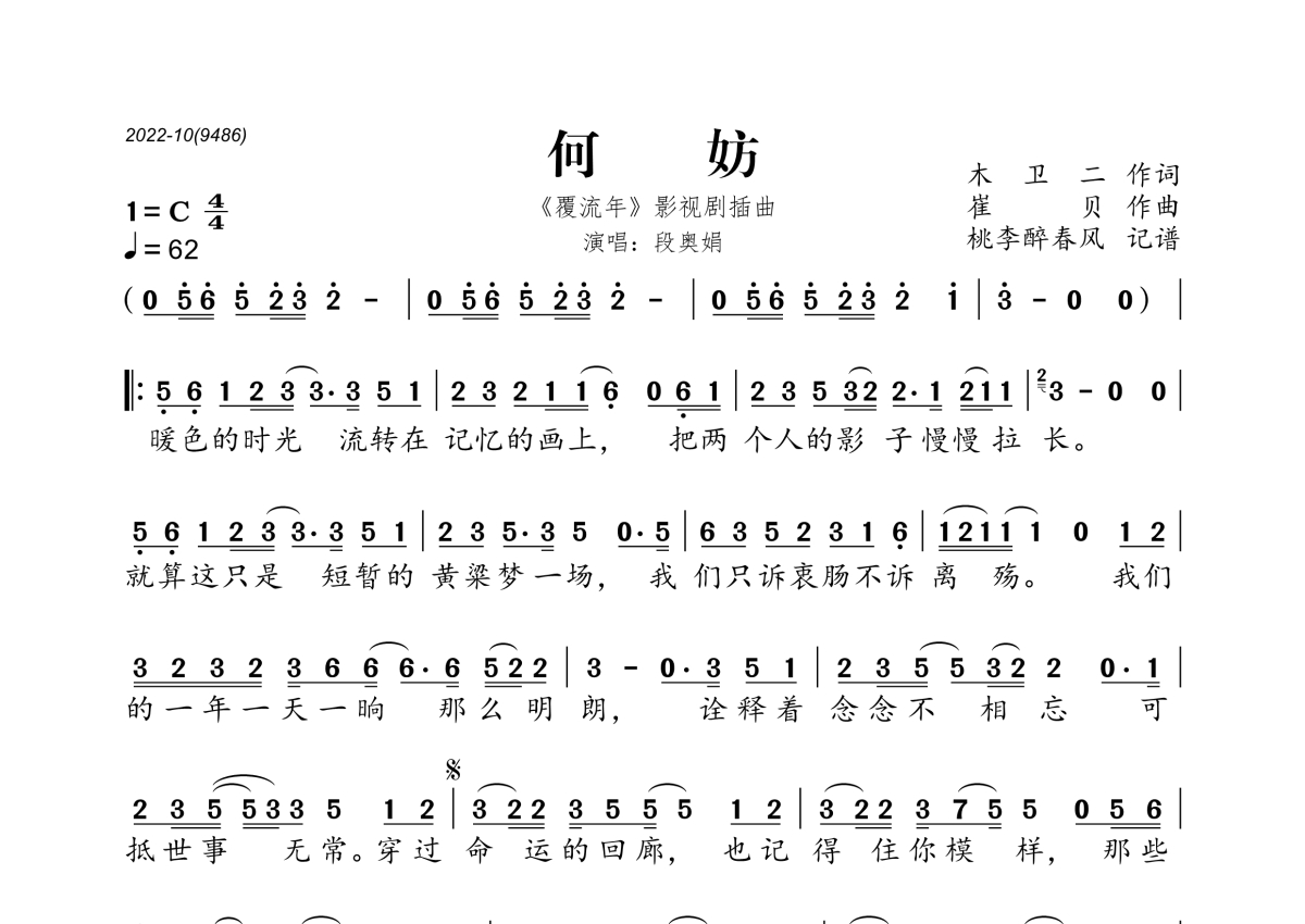 《何妨》是段奥娟演唱的一首歌曲,拍号为4/4拍,歌曲速度为每分钟62拍,这份简谱共有一张高清图谱,图谱由 @桃李醉春风 编配上传。