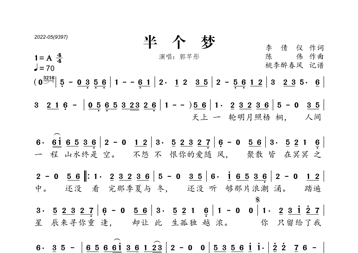 《半个梦》是郭芊彤演唱的一首歌曲,拍号为4/4拍,歌曲速度为每分钟70拍,这份简谱共有一张高清图谱,图谱由 @桃李醉春风 编配上传。