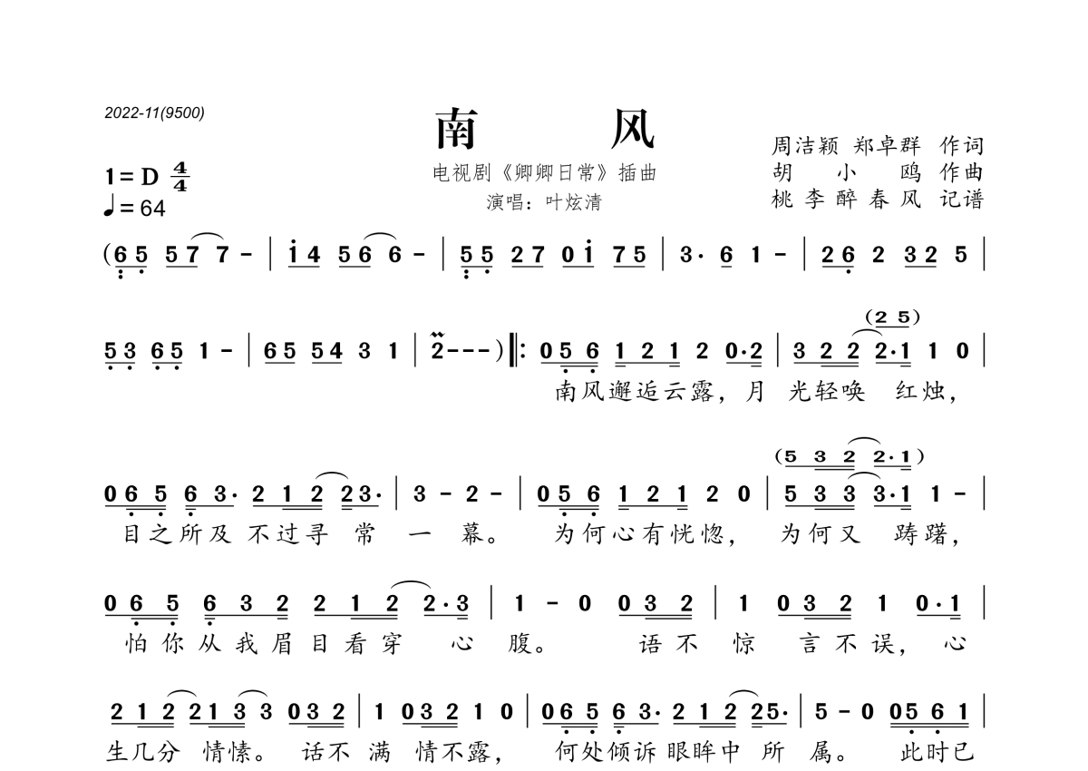 《南风》是叶炫清演唱的一首歌曲,拍号为4/4拍,歌曲速度为每分钟64拍,这份简谱共有一张高清图谱,图谱由 @桃李醉春风 编配上传。