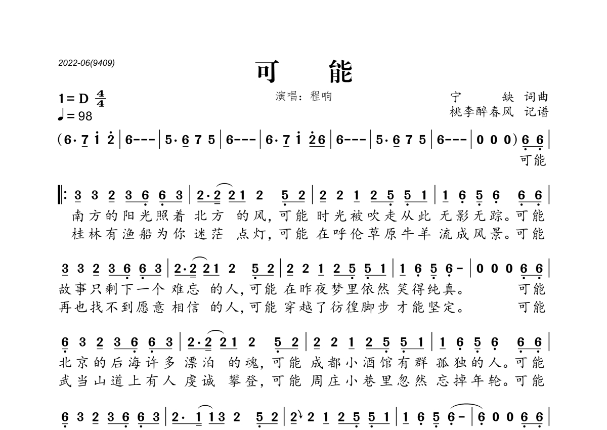 《可能》是程响演唱的一首歌曲,拍号为4/4拍,歌曲速度为每分钟98拍,这份简谱共有一张高清图谱,图谱由 @桃李醉春风 编配上传。