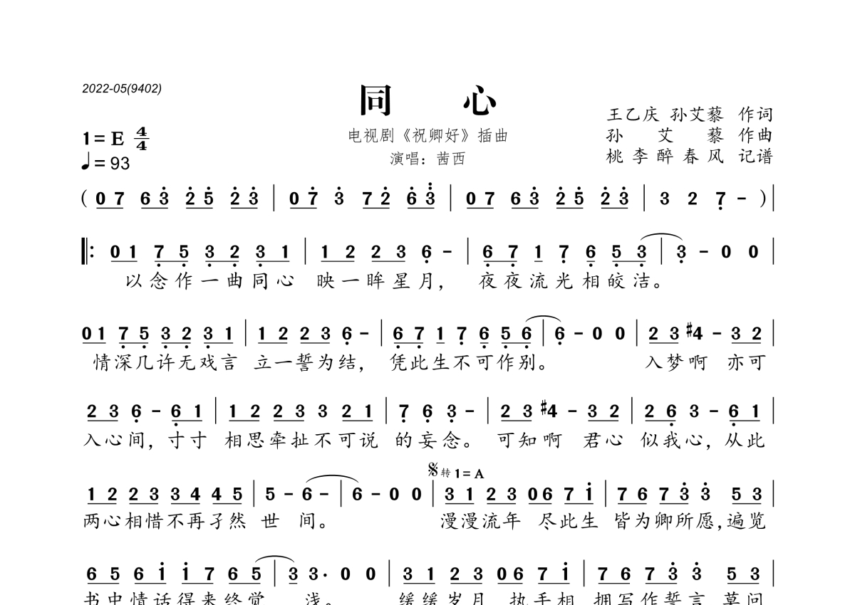 《同心》是茜西演唱的一首歌曲,拍号为4/4拍,歌曲速度为每分钟93拍,这份简谱共有一张高清图谱,图谱由 @桃李醉春风 编配上传。