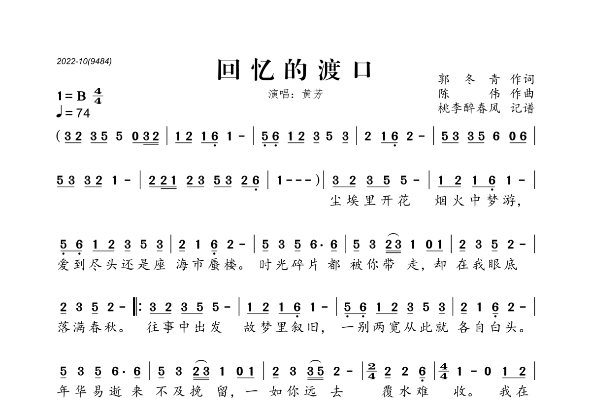 《回忆的渡口》是黄芳演唱的一首歌曲,拍号为4/4拍,歌曲速度为每分钟74拍,这份简谱共有一张高清图谱,图谱由 @桃李醉春风 编配上传。