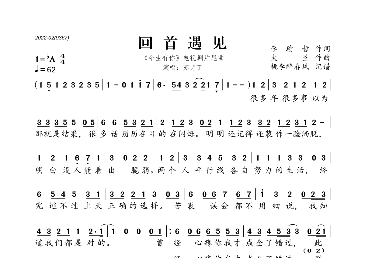 《回首遇见》是苏诗丁演唱的一首歌曲,拍号为4/4拍,歌曲速度为每分钟62拍,这份简谱共有一张高清图谱,图谱由 @桃李醉春风 编配上传。