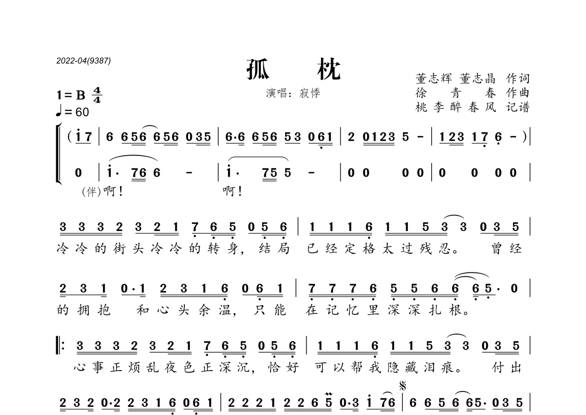 《孤枕》是寂悸演唱的一首歌曲,拍号为4/4拍,歌曲速度为每分钟60拍,这份简谱共有一张高清图谱,图谱由 @桃李醉春风 编配上传。