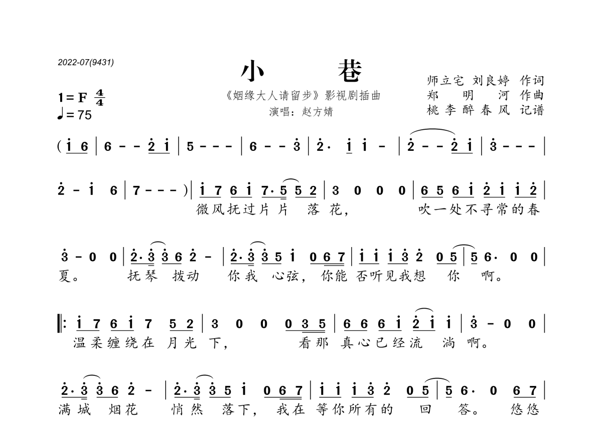 《小巷》是赵方婧演唱的一首歌曲,拍号为4/4拍,歌曲速度为每分钟75拍,这份简谱共有一张高清图谱,图谱由 @桃李醉春风 编配上传。