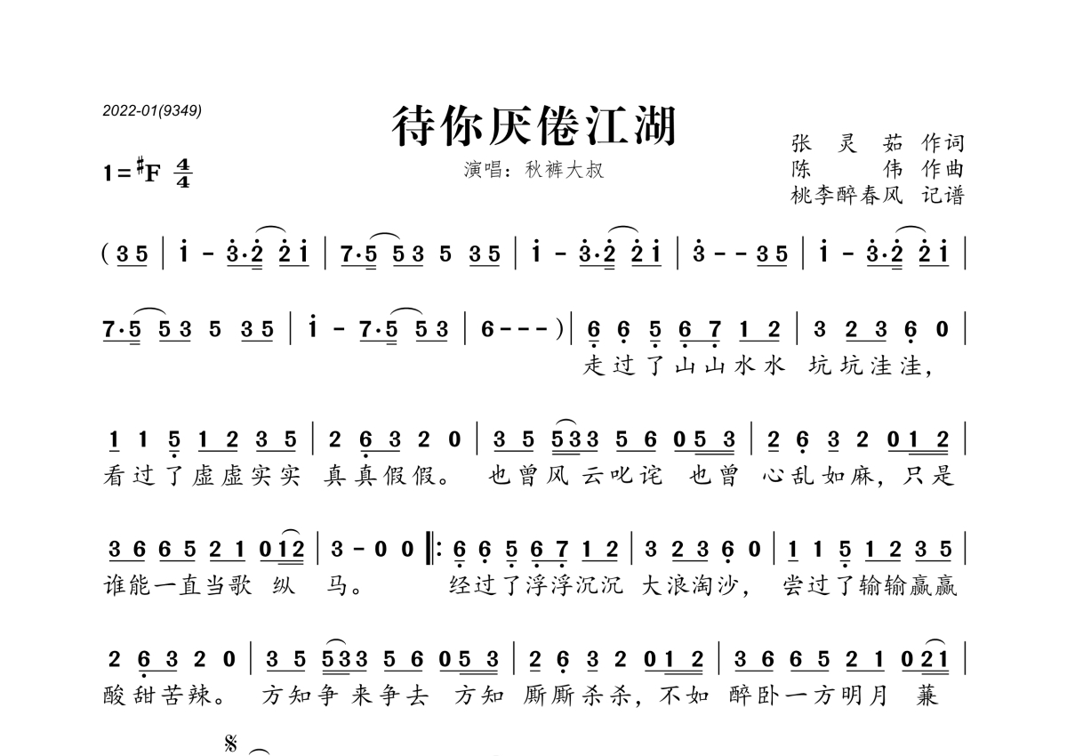 《待你厌倦江湖》是秋裤大叔演唱的一首歌曲,拍号为4/4拍,这份简谱共有一张高清图谱,图谱由 @桃李醉春风 编配上传。