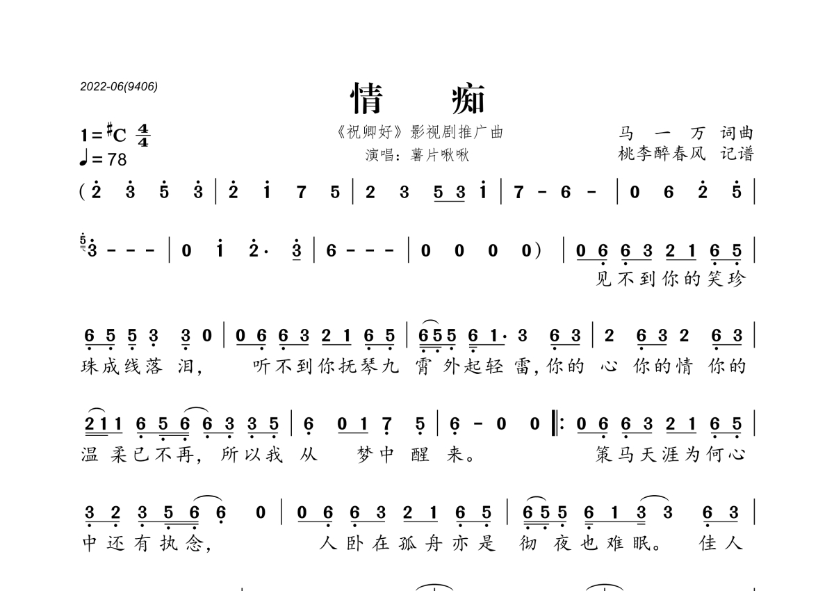《情痴》是薯片啾啾演唱的一首歌曲,拍号为4/4拍,歌曲速度为每分钟78拍,这份简谱共有一张高清图谱,图谱由 @桃李醉春风 编配上传。