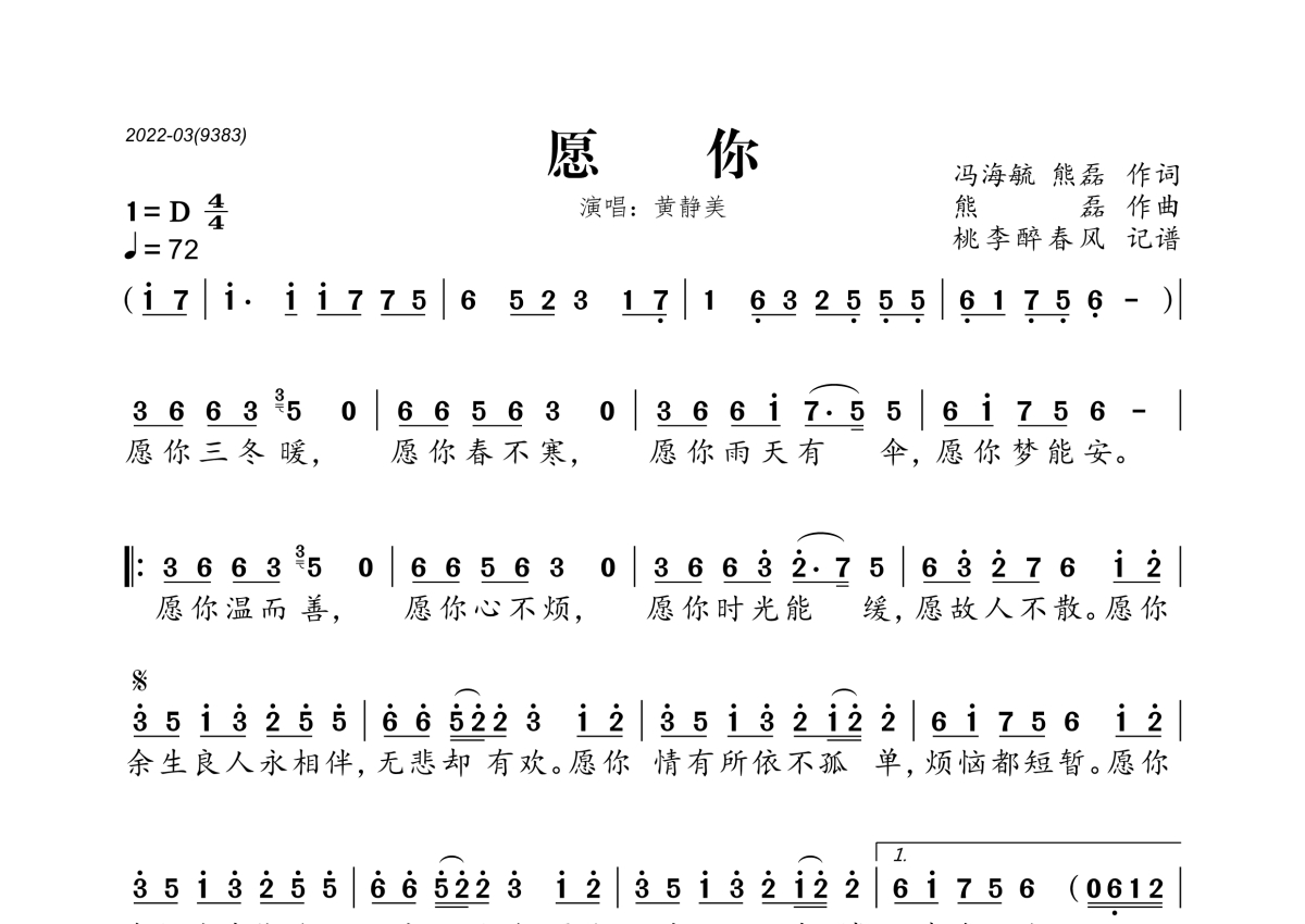 《愿你》是黄静美演唱的一首歌曲,拍号为4/4拍,歌曲速度为每分钟72拍,这份简谱共有一张高清图谱,图谱由 @桃李醉春风 编配上传。