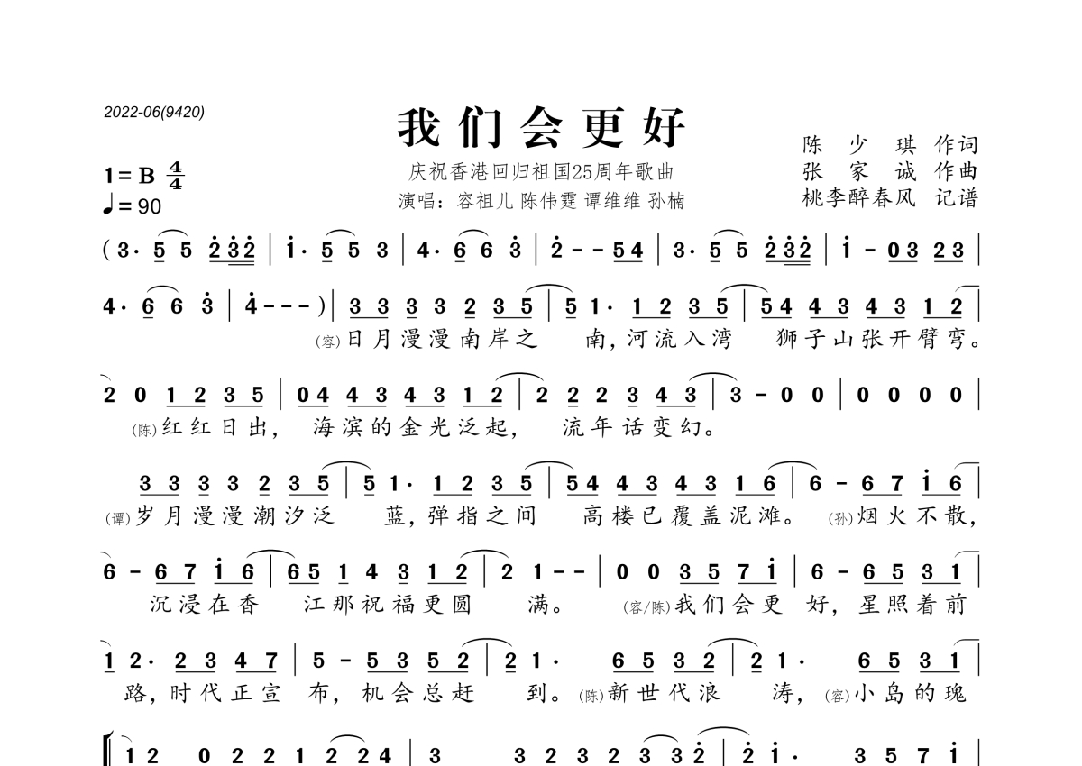 《我们会更好》是容祖儿&陈伟霆&谭维维&孙楠演唱的一首歌曲,拍号为4/4拍,歌曲速度为每分钟90拍,这份简谱共有两张高清图谱,图谱由 @桃李醉春风 编配上传。