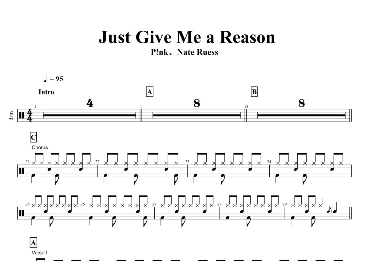 《Just Give Me a Reason》是P!nk/奈特·罗伊斯演唱的一首歌曲,这份鼓谱共有两张高清图谱,图谱由 @打鼓谱 编配上传,图谱使用五线谱编配,使用这份Just Give Me a Reason架子鼓谱,你将能够轻松地敲打出这首P!nk/奈特·罗伊斯的Just Give Me a Reason,快来尝试吧。《Just Give Me a Reason》是美国女歌手P!nk和男歌手奈特·罗伊斯演唱的一首流行歌曲,作为P!nk的第六张录音室专辑《The Truth About Love》的第三发歌曲,于2013年2月26日发行。 [1]