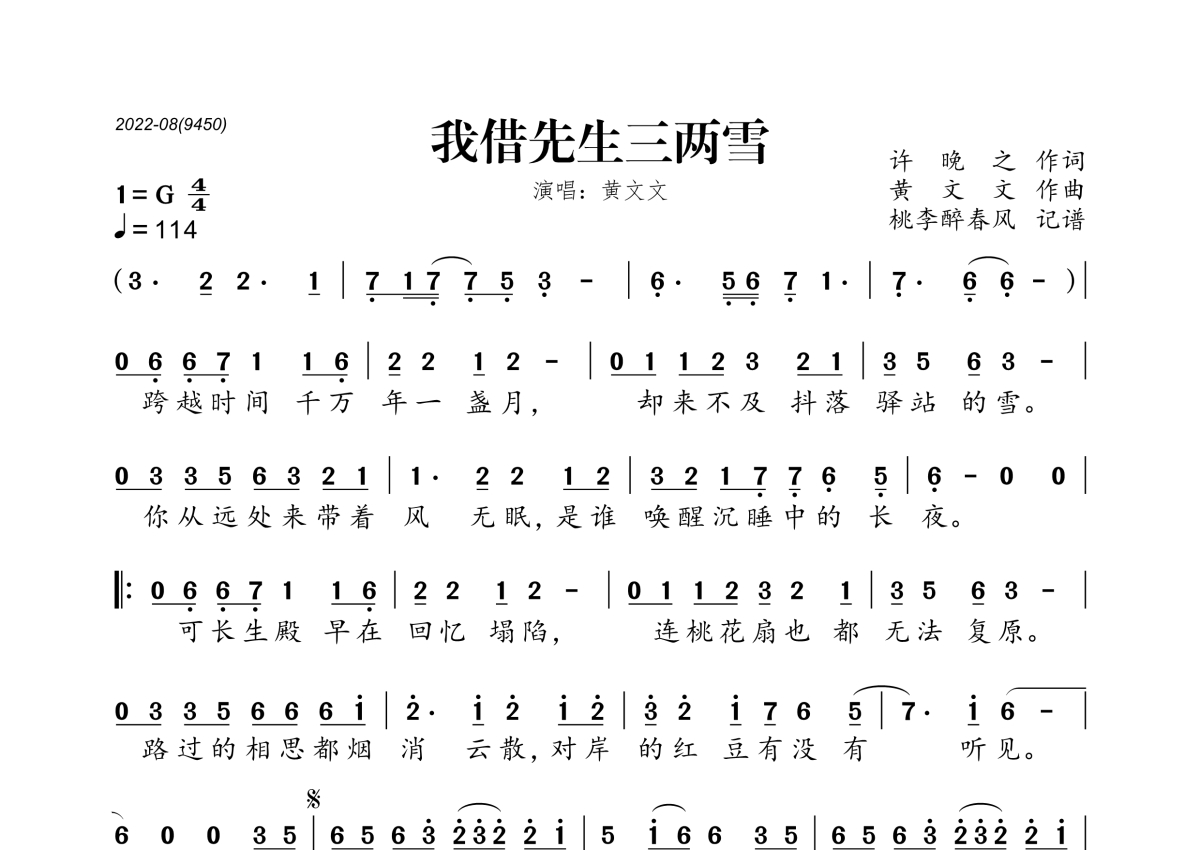 《我借先生三两雪》是黄文文演唱的一首歌曲,拍号为4/4拍,歌曲速度为每分钟114拍,这份简谱共有一张高清图谱,图谱由 @桃李醉春风 编配上传。