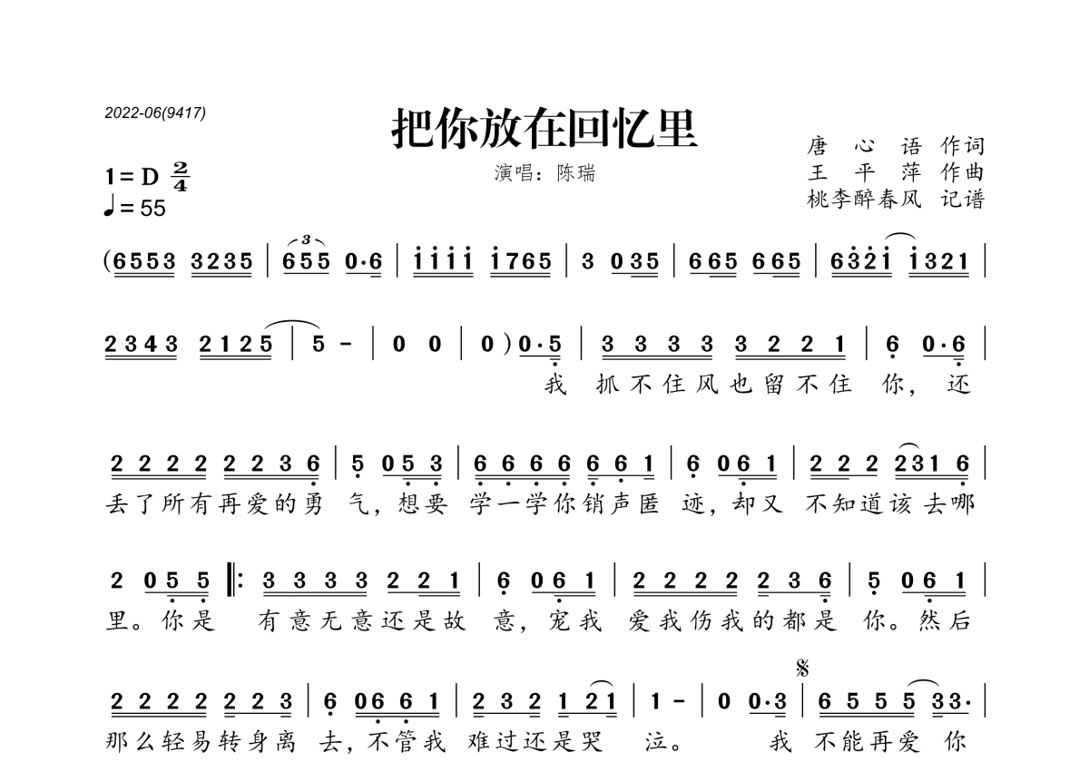 《把你放在回忆里》是陈瑞演唱的一首歌曲,拍号为2/4拍,歌曲速度为每分钟55拍,这份简谱共有一张高清图谱,图谱由 @桃李醉春风 编配上传。