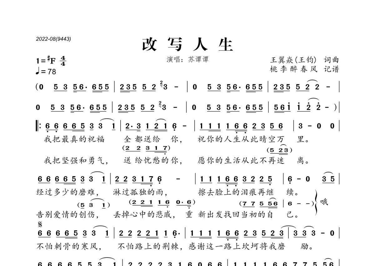 《改写人生》是苏谭谭演唱的一首歌曲,拍号为4/4拍,歌曲速度为每分钟78拍,这份简谱共有一张高清图谱,图谱由 @桃李醉春风 编配上传。