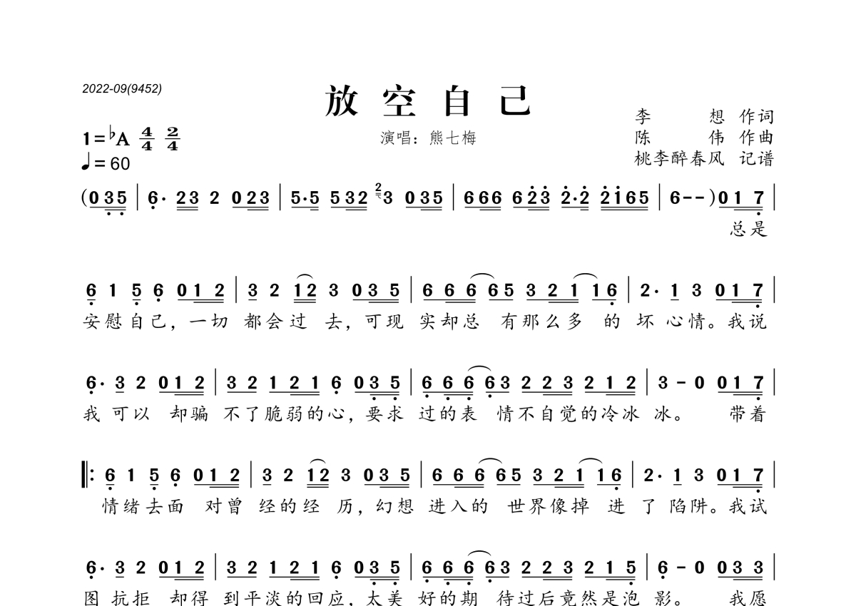《放空自己》是熊七梅演唱的一首歌曲,拍号为4/4拍,歌曲速度为每分钟60拍,这份简谱共有一张高清图谱,图谱由 @桃李醉春风 编配上传。
