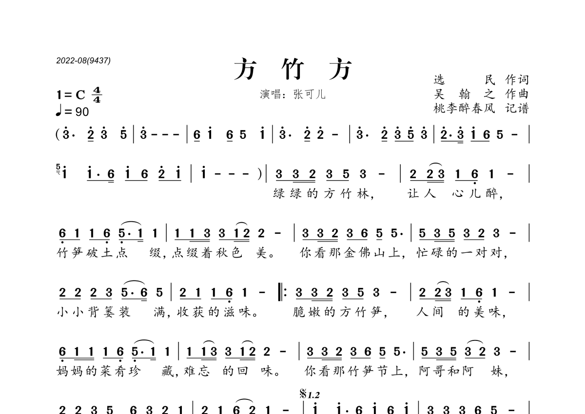 《方竹方》是张可儿演唱的一首歌曲,拍号为4/4拍,歌曲速度为每分钟90拍,这份简谱共有一张高清图谱,图谱由 @桃李醉春风 编配上传。
