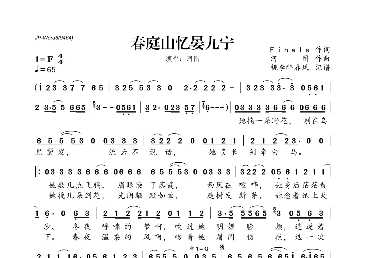 《春庭山忆晏九宁》是河图演唱的一首歌曲,拍号为4/4拍,歌曲速度为每分钟65拍,这份简谱共有一张高清图谱,图谱由 @桃李醉春风 编配上传。