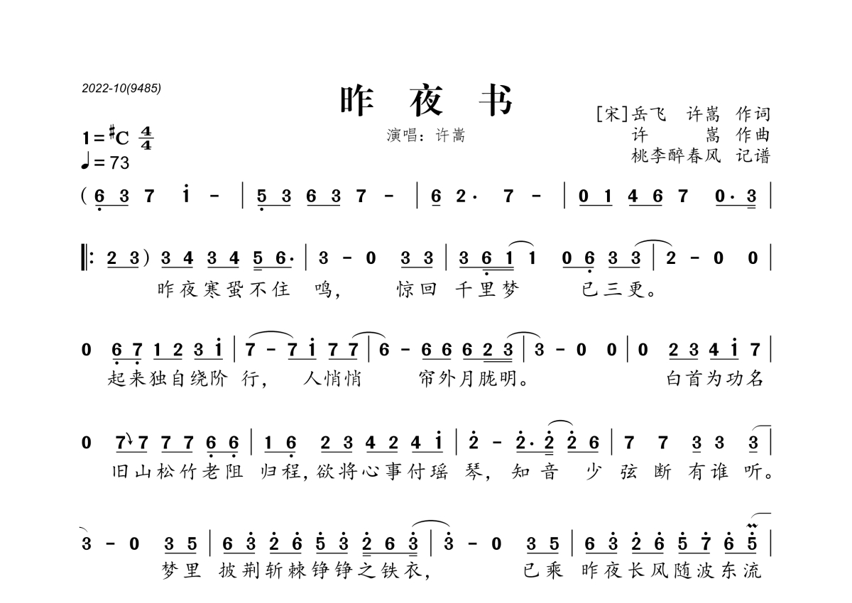 《昨夜书》是许嵩演唱的一首歌曲,拍号为4/4拍,歌曲速度为每分钟73拍,这份简谱共有一张高清图谱,图谱由 @桃李醉春风 编配上传。