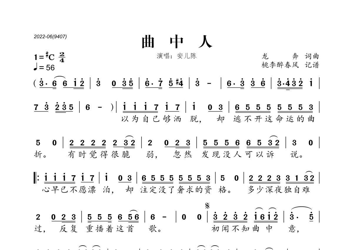 《曲中人》是安儿陈演唱的一首歌曲,拍号为2/4拍,歌曲速度为每分钟56拍,这份简谱共有一张高清图谱,图谱由 @桃李醉春风 编配上传。
