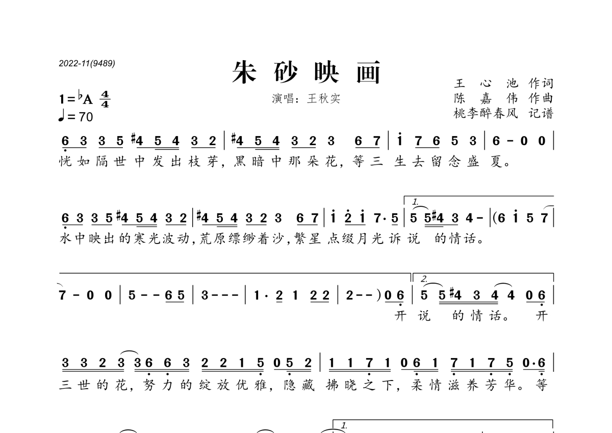 《朱砂映画》是王秋实演唱的一首歌曲,拍号为4/4拍,歌曲速度为每分钟70拍,这份简谱共有一张高清图谱,图谱由 @桃李醉春风 编配上传。