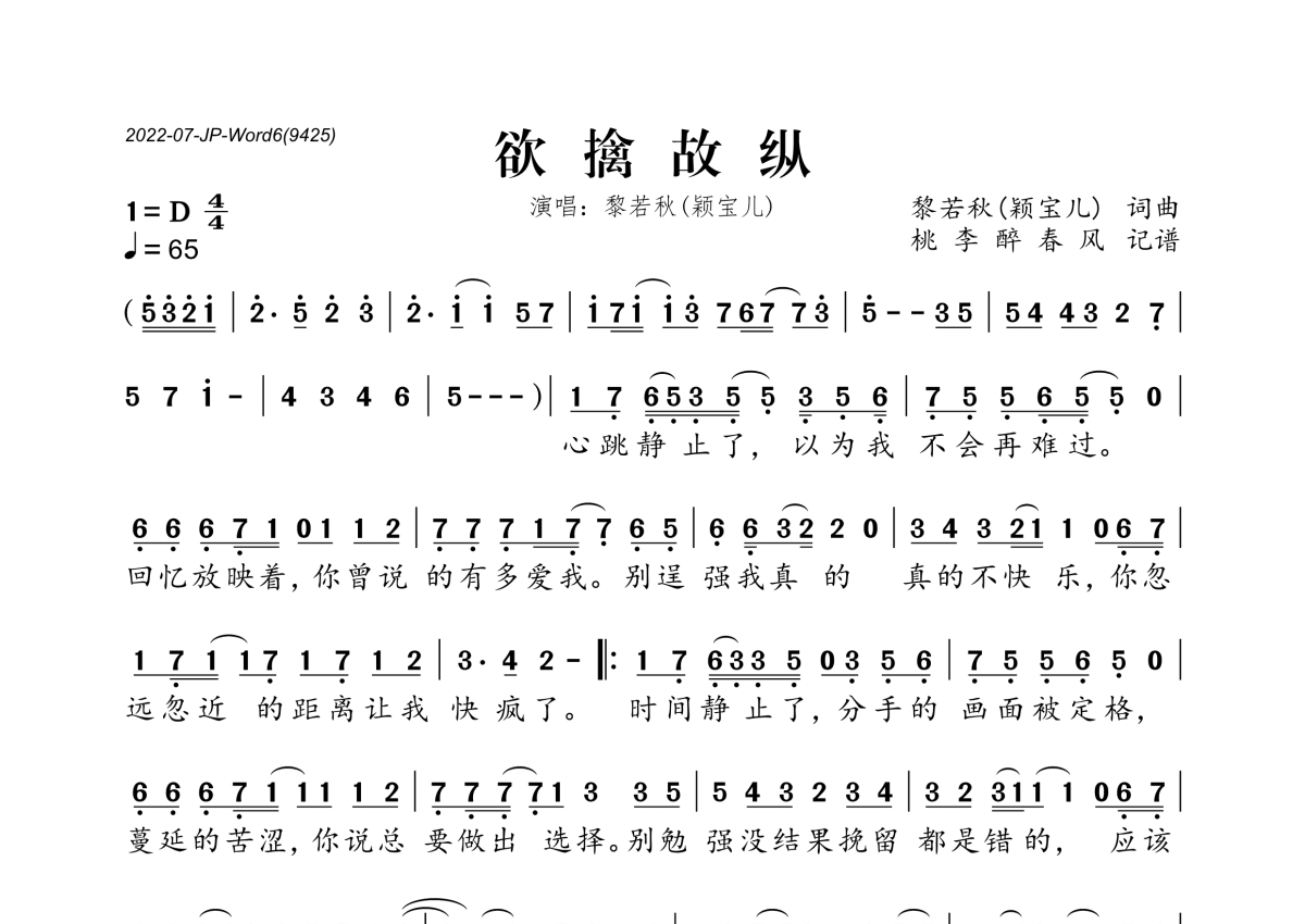《欲擒故纵》是黎若秋(颖宝儿)演唱的一首歌曲,拍号为4/4拍,歌曲速度为每分钟65拍,这份简谱共有一张高清图谱,图谱由 @桃李醉春风 编配上传。