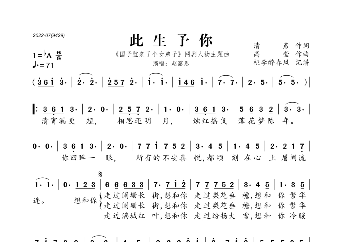 《此生予你》是赵露思演唱的一首歌曲,拍号为6/8拍,歌曲速度为每分钟71拍,这份简谱共有一张高清图谱,图谱由 @桃李醉春风 编配上传。