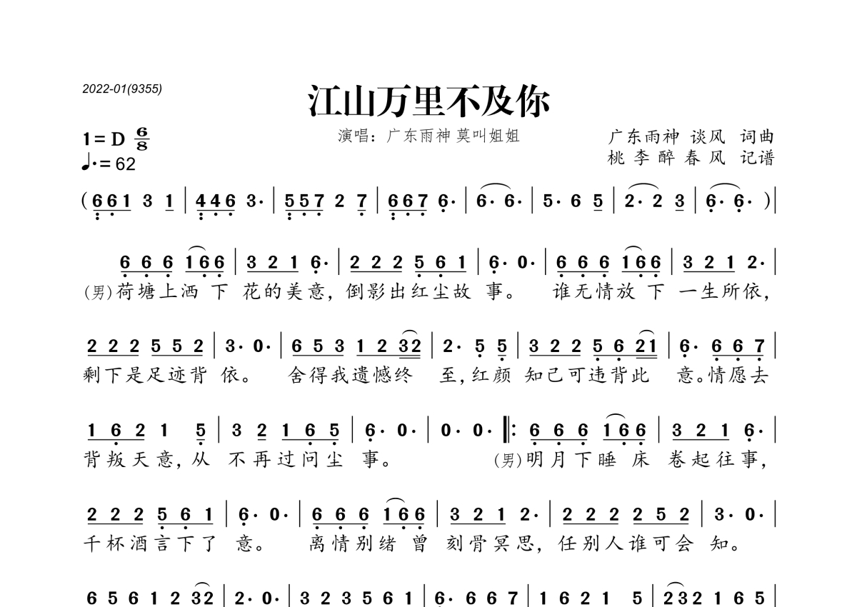 《江山万里不及你》是广东雨神&莫叫姐姐演唱的一首歌曲,拍号为6/8拍,歌曲速度为每分钟62拍,这份简谱共有一张高清图谱,图谱由 @桃李醉春风 编配上传。