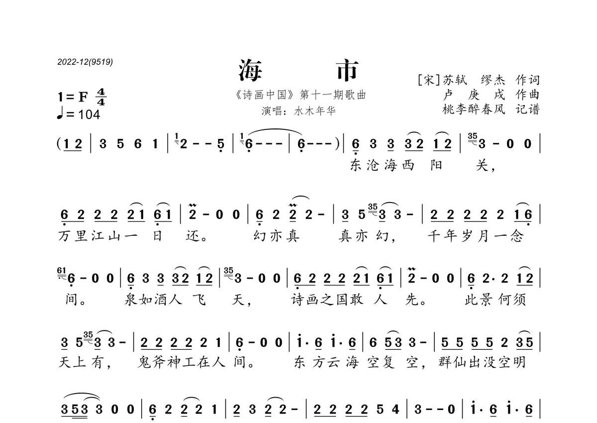 《海市》是水木年华演唱的一首歌曲,拍号为4/4拍,歌曲速度为每分钟104拍,这份简谱共有两张高清图谱,图谱由 @桃李醉春风 编配上传。