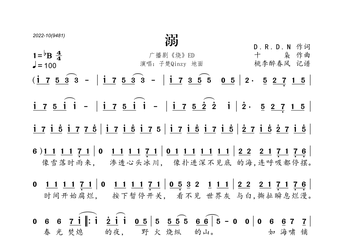 《溺》是子楚Qinzy&地面演唱的一首歌曲,拍号为4/4拍,歌曲速度为每分钟100拍,这份简谱共有一张高清图谱,图谱由 @桃李醉春风 编配上传。
