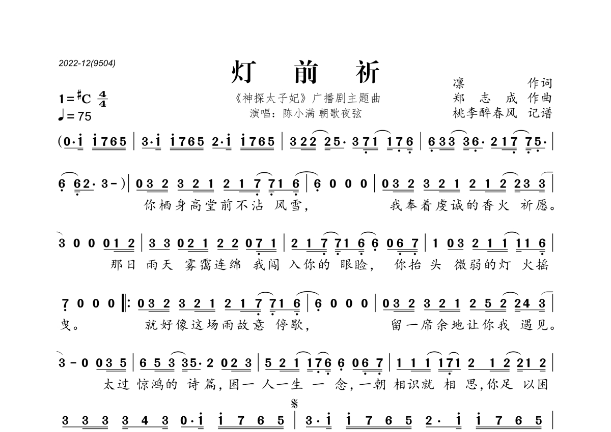 《灯前祈》是陈小满&朝歌夜弦演唱的一首歌曲,拍号为4/4拍,歌曲速度为每分钟75拍,这份简谱共有一张高清图谱,图谱由 @桃李醉春风 编配上传。
