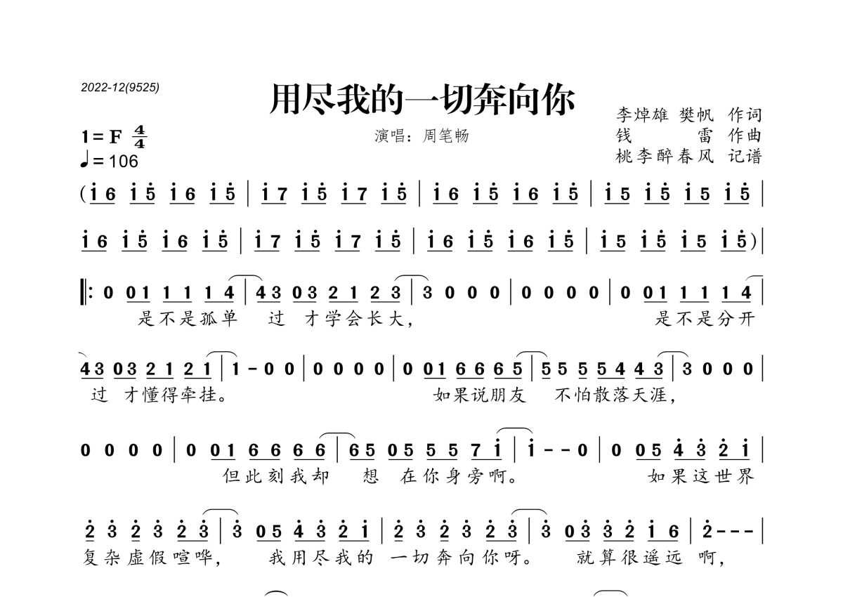 《用尽我的一切奔向你》是周笔畅演唱的一首歌曲,拍号为4/4拍,歌曲速度为每分钟106拍,这份简谱共有一张高清图谱,图谱由 @桃李醉春风 编配上传。