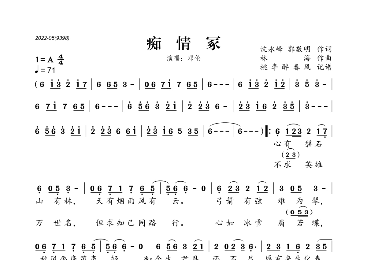 《痴情冢》是邓伦演唱的一首歌曲,拍号为4/4拍,歌曲速度为每分钟71拍,这份简谱共有一张高清图谱,图谱由 @桃李醉春风 编配上传。