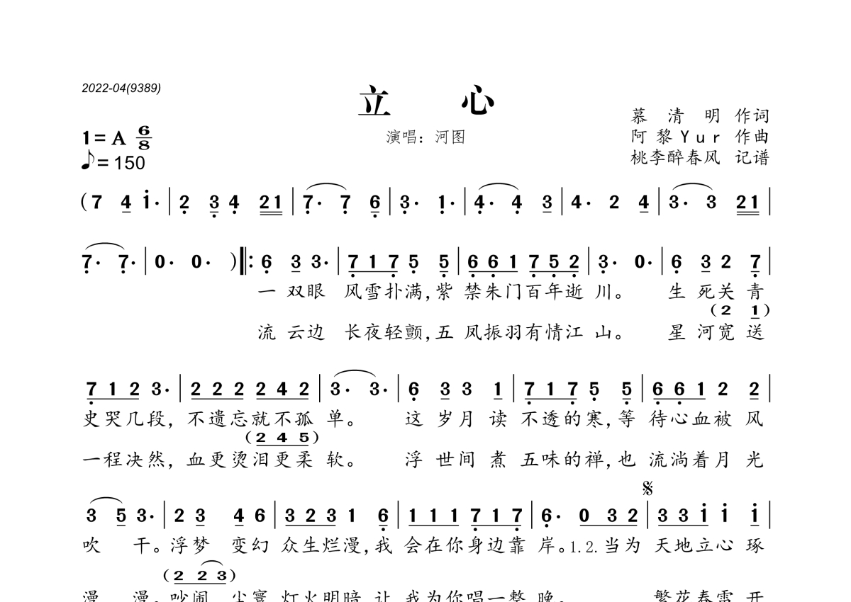 《立心》是河图演唱的一首歌曲,拍号为6/8拍,歌曲速度为每分钟150拍,这份简谱共有一张高清图谱,图谱由 @桃李醉春风 编配上传。