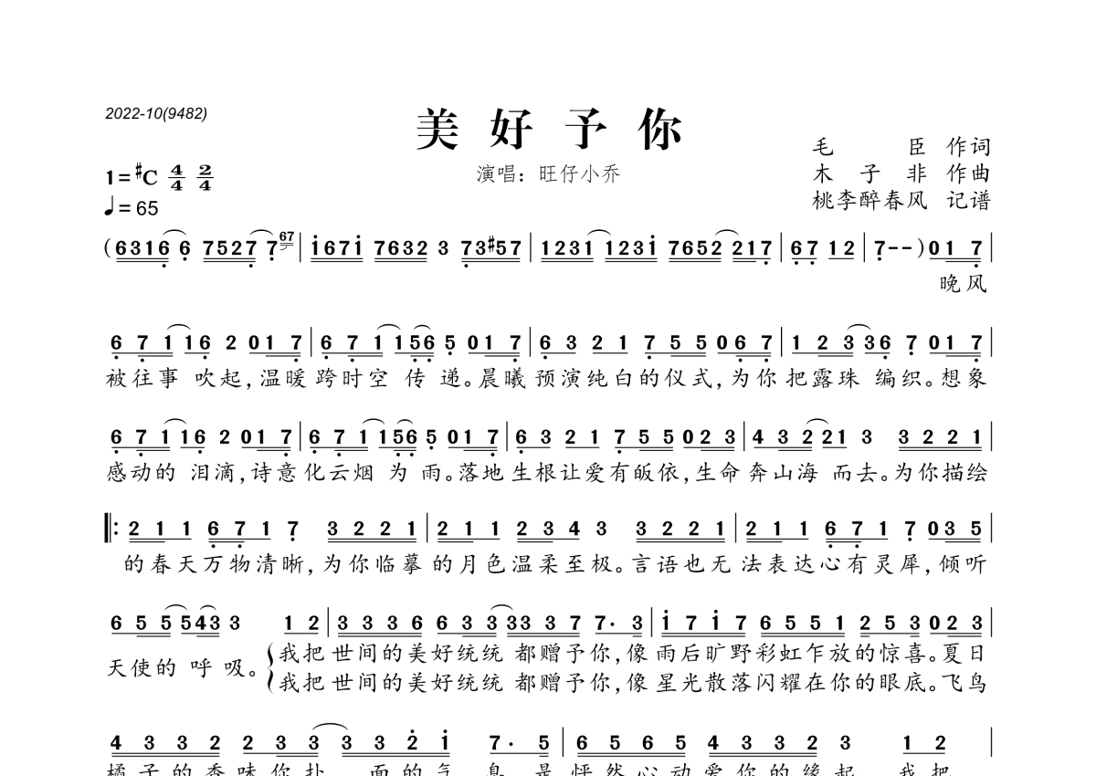 《美好予你》是旺仔小乔演唱的一首歌曲,拍号为4/4拍,歌曲速度为每分钟65拍,这份简谱共有一张高清图谱,图谱由 @桃李醉春风 编配上传。