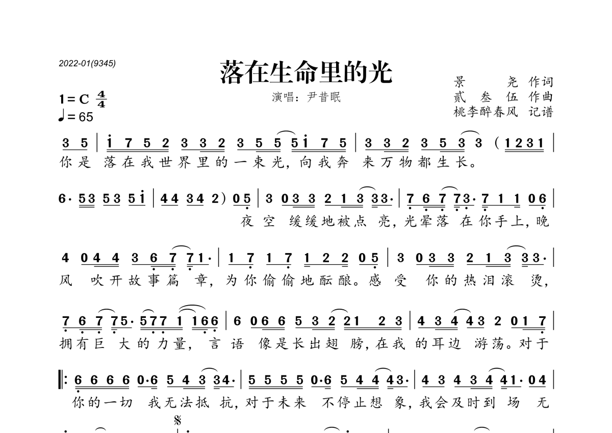 《落在生命里的光》是尹昔眠演唱的一首歌曲,拍号为4/4拍,歌曲速度为每分钟65拍,这份简谱共有一张高清图谱,图谱由 @桃李醉春风 编配上传。
